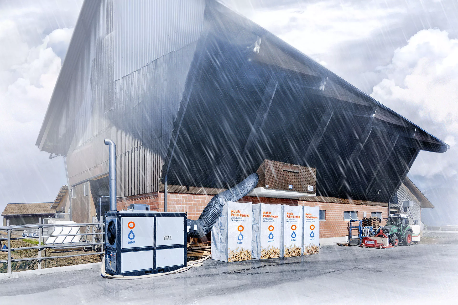 Teure Investitionen in eine eigene Pellet-Heizung sind zudem keine notwendig um von den Vorteilen profitieren zu können. Denn speziell für die Heutrocknung hat die Suter Entfeuchtungstechnik AG aus Lupfig als einziger Anbieter in der Schweiz ein massgeschneidertes Paket geschnürt. Die Anlage wird rasch geliefert, direkt an die Kaltluftansaugung des Heugebläses angeschlossen und ist sofort betriebsbereit. Zusätzliche Pellets können einfach nachbestellt werden und in der Mietpauschale inbegriffen ist ausserdem ein 24-Stunden-Pikettdienst – damit das Heu jederzeit sicher ins Trockene gebracht werden kann.